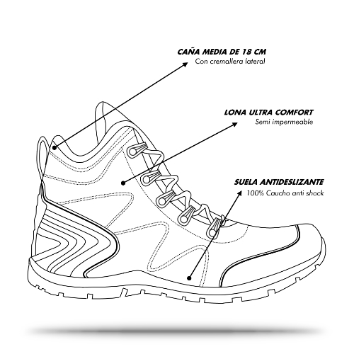Nuestra Misión fue desarrollar un producto que combinara la dureza, resistencia y durabilidad de unas zapatillas de alto performance, Construimos unas botas listas para entregarlo todo en tierra y asfalto, Capellada en Lona ultra resistente que repele el agua, Apliques y cordoneras inyectadas en TPU y suela antideslizante en caucho de alto agarre, Plantilla interior en EVA y forro lycra para una increíble experiencia y confort.