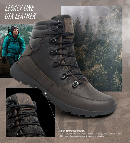 Botas Outdoor Legacy Cafe Caña media, Fabricadas en Cuero, Lona impermeable huracán, Suela en caucho shock zero, Capellada en Cuero legitimo de alta densidad, cordoneras en Tpu, Plantilla se mi ortopédica, Peso: 820 Gramos el par aproximadamente según la talla.